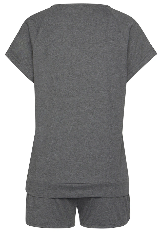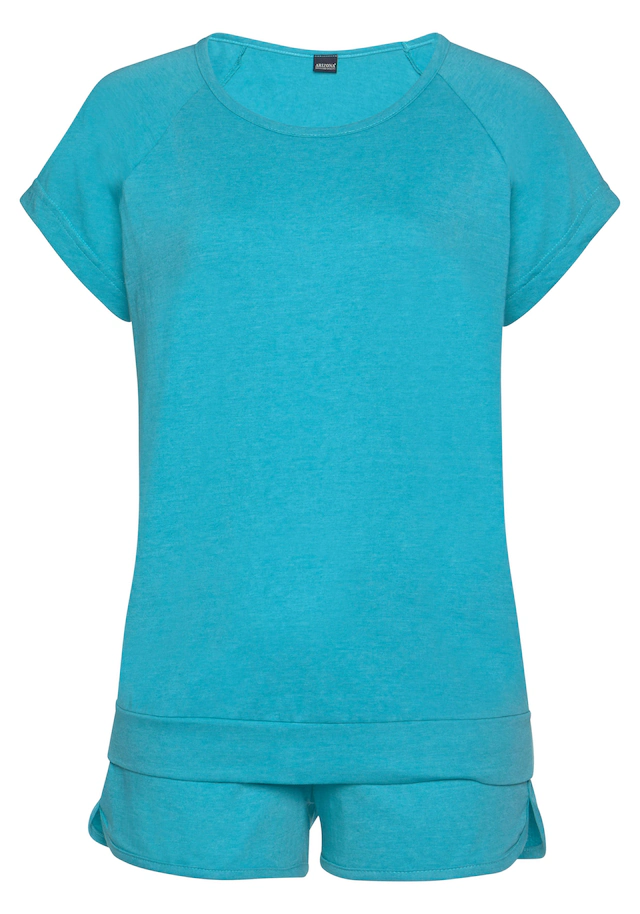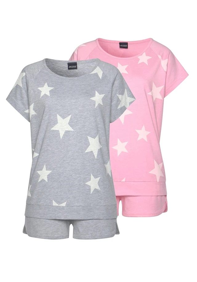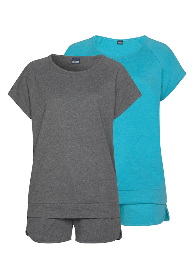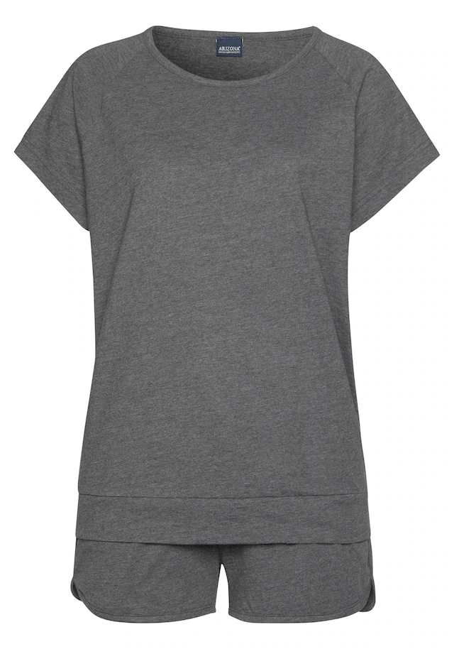 Der sportlich melierte Shorty im Doppelpack von Arizona beschert dir süße Träume! Das Schlafshirt hat kurze Raglanärmel, einen femininen Rundhalsausschnitt und elastische Bündchen – die kurze Schlafhose punktet mit elastischem Tunnelzugbund und paspelierten, leicht gerundeten Beinsäumen mit Seitenschlitzen. Der kurze Schlafanzug aus weicher Single-Jersey-Qualität ist mit hohem Baumwollanteil gearbeitet und trägt sich superangenehm auf der Haut. Auch an heißen Tagen der ideale Basic-Pyjama für erholsame Nächte – der melierte Shorty von Arizona! Aus 60% Baumwolle und 40% Polyester. Grau Melange 90% Baumwolle, 10% Polyester