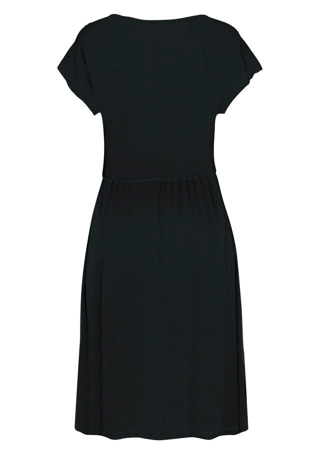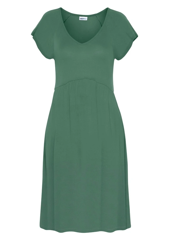 Kleid von Beach Time mit tiefem V-Ausschnitt, kurze Ärmel, elastische Taillenpartie. Ausgestellte Saumweite. Weich fließende Viskosequalität.