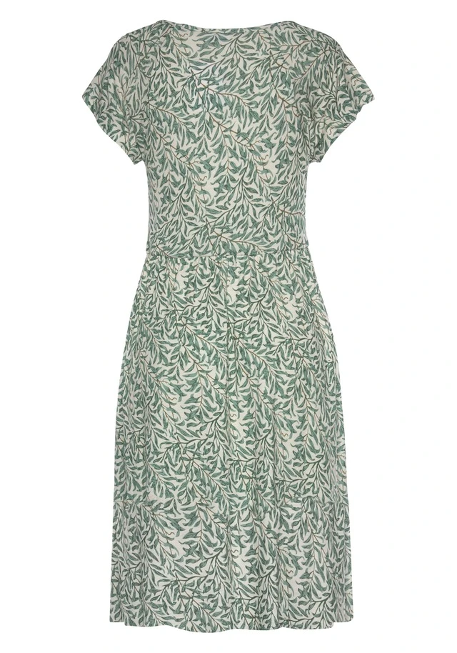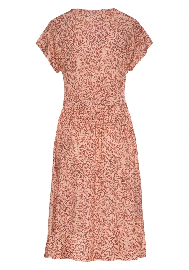 Kleid von Beach Time mit Allovermuster. Tiefer V-Ausschnitt, kurze Ärmel, elastische Taillenpartie. Ausgestellte Saumweite. Weich fließende Viskosequalität.