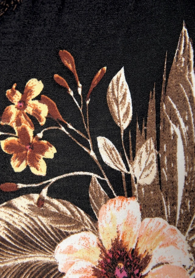 Mit elastischem Carmenausschnitt. An den kurzen Ärmeln mit Bändern zum Knoten. Lässig geschnitten. Jedes Teil ein Unikat! Rückenlänge ca. 78 cm. Angenehme Qualität aus 100% Viskose.