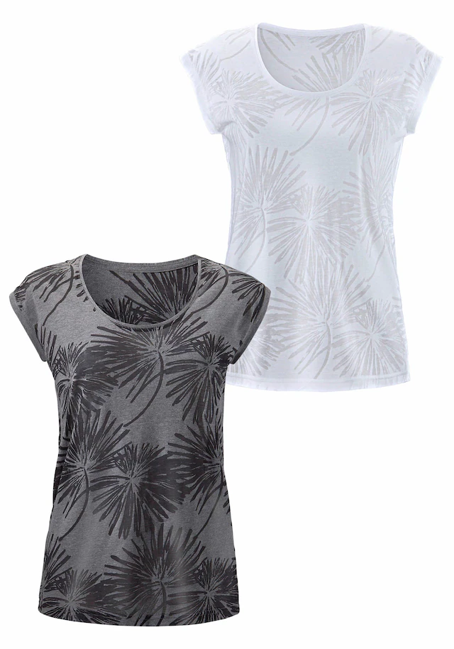 Beachtime Shirts im 2er-Pack. Modischer Ausbrenner mit Palmenmuster. Hinten mit einem etwas längeren und gerundeten Saum. Aus einer besonders weich fließenden Qualität.