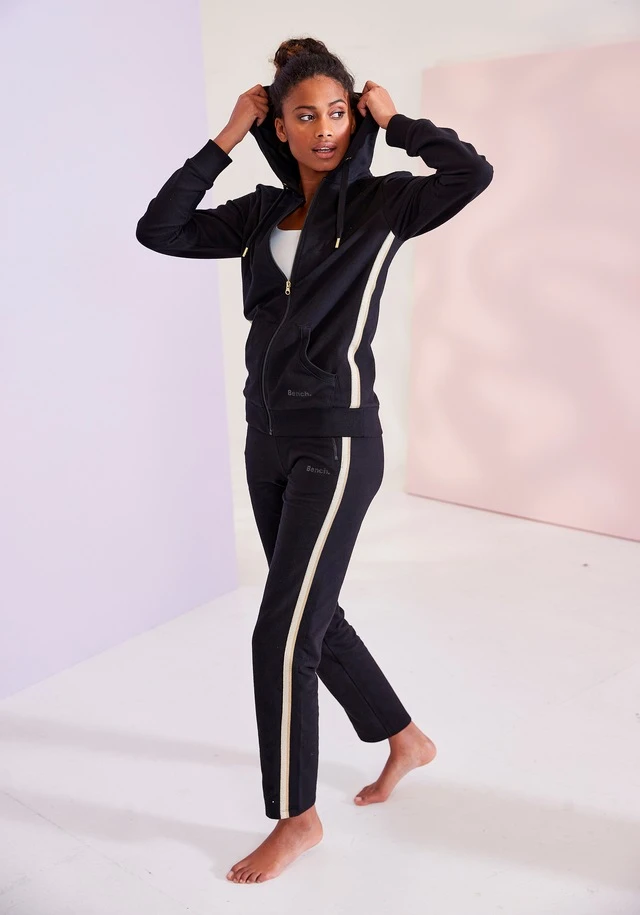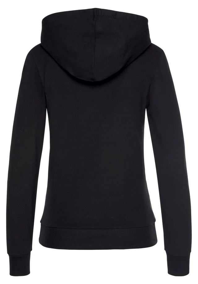 Kapuzensweatjacke von Bench mit Kontraststreifen. Kapuze mit Tunnelzug, durchgehender Reißverschluss und Kängurutasche. Elastische Rippbündchen. Bequeme Basic-Passform. Von innen weich angeraute Sweatqualität.