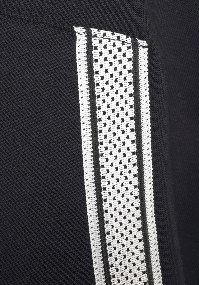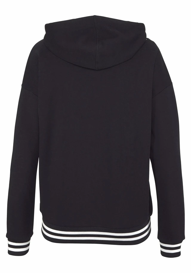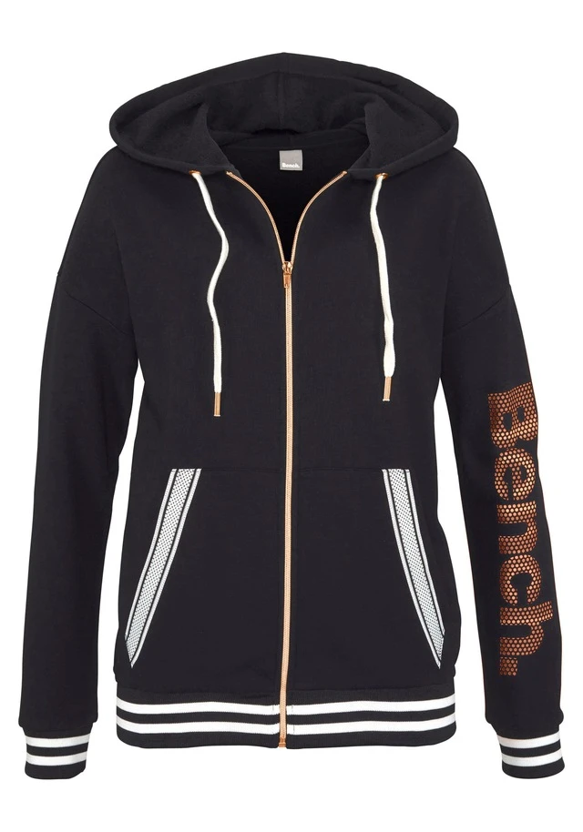 Sportliche Bench Kapuzenjacke mit Tapestreifen in Häkeloptik an den Taschen und gepunkteten Logoprint am Ärmel. Aus 70% Baumwolle, 19% Modal, 11% Polyester.