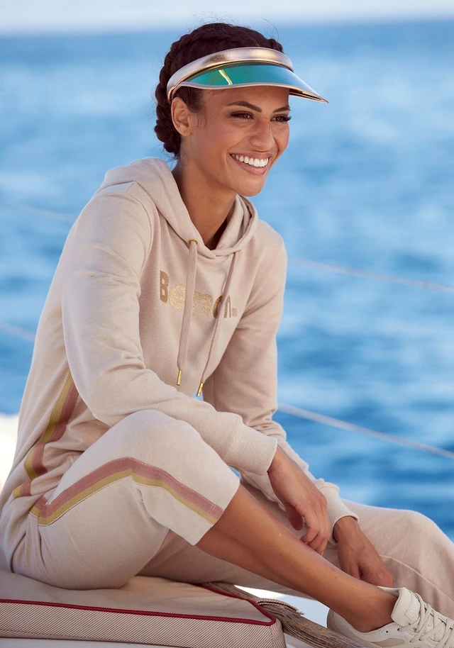 Caprihose von Bench mit Kontraststreifen. Tunnelzugbund und Eingrifftaschen. Kleiner Logoprint. Figurnahe Passform. Von innen weich angeraute Sweatqualität.