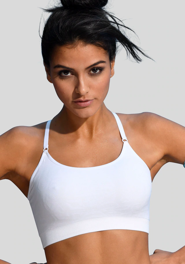 In Bustierform. Eingestricktes, grafisches Muster. Nahtlose Verarbeitung, doppellagig. Verstellbare, elastische Träger, hinten zusammenhakbar – ideal für sportliche Racerback-Shirts. Aus 60% Polyamid, 32% Polyester, 8% Elasthan (LYCRA®). BHs sind nicht trocknergeeignet, da die Versteller und Ringe durch die Hitze beschädigt werden und brechen.