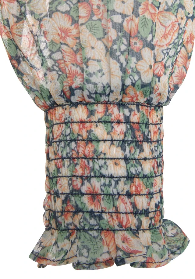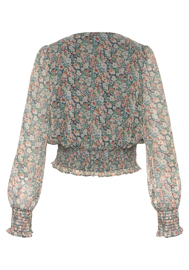 Romantische Langarmbluse von Buffalo mit Alloverprint und Smokbund. Hübscher Cache-coeur-Ausschnitt. Lange Ärmel mit Smokbündchen an den Abschlüssen. Teilweise gefüttert. Für besondere Outfits. Leicht transparente Ware.