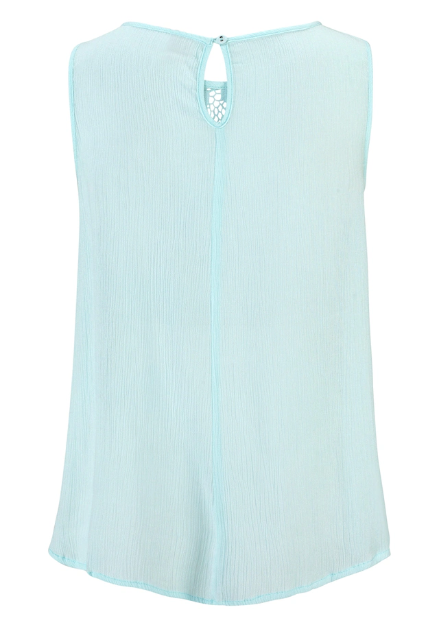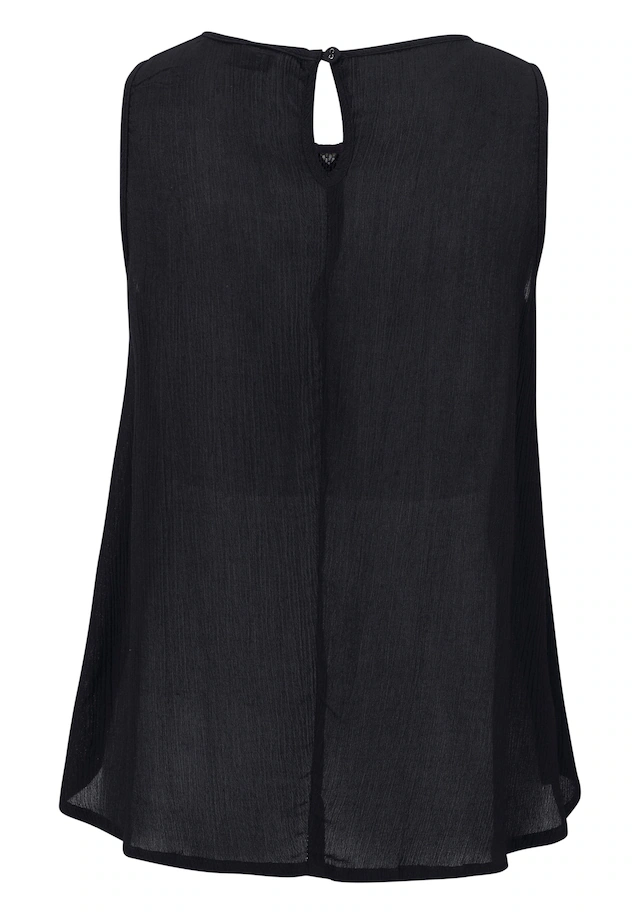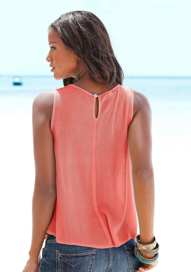 Aus gekreppter Ware. Süßer Strand-Look mit besticktem Einsatz im Brustbereich. Darunter mit Kräuselung und leicht ausgestelltem Saum. Knopfverschluss und kleiner Schlitz im Nacken. Rückenlänge ca. 66 cm. Weich fließende Qualität aus 100% Viskose. Einsatz aus 100% Baumwolle.