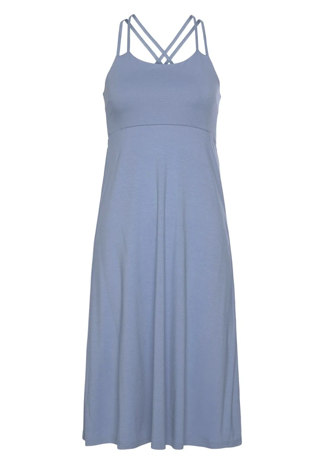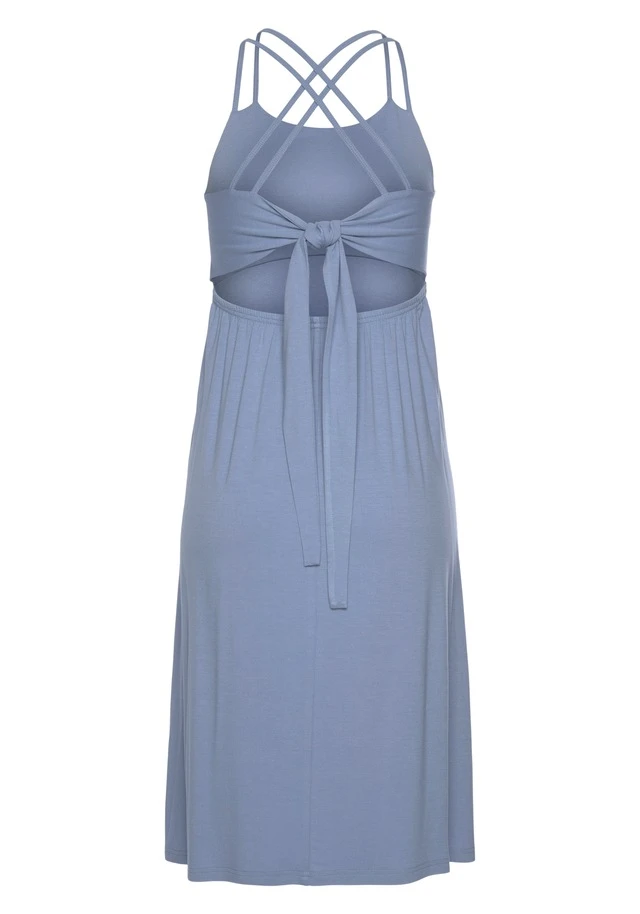 Kleid von BUFFALO mit doppelten Spaghettiträgern, im Rücken gekreuzt. Hinten mit Öffnung und Schleife zum Knoten. Rocklänge ca. 70 cm. Weicher Viskosejersey.