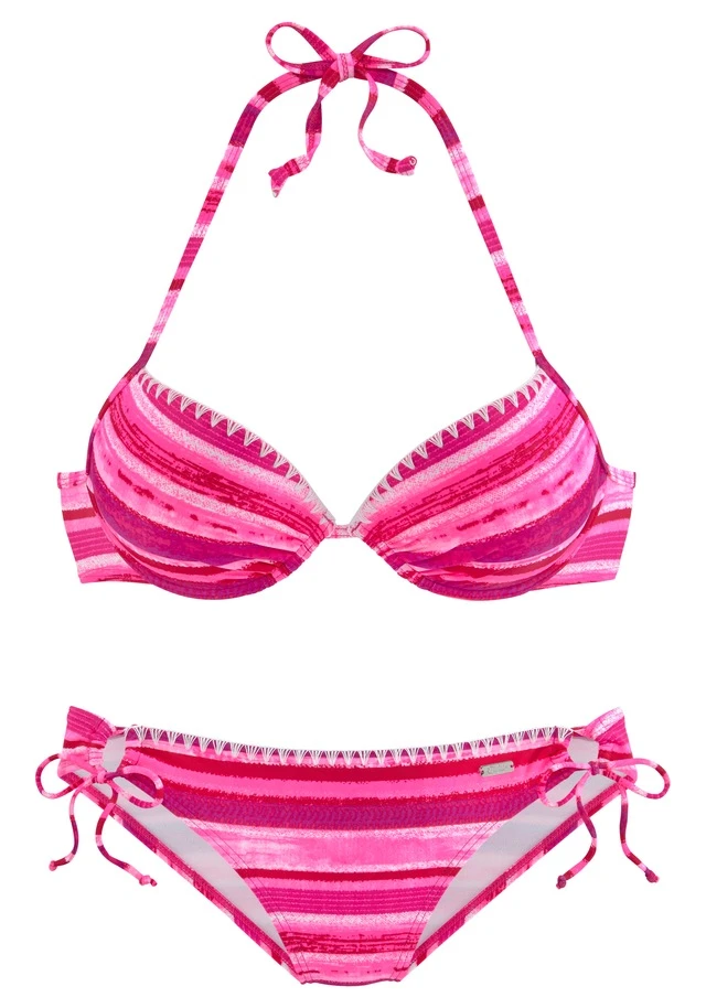 Modisch gestreifter Push-up-Bikini von Buffalo mit abgesetzter Häkelkante. Wattierte Cups mit eingearbeiteter Verstärkung. Klassisch geschnittene Bikinihose mit seitlichen Bindebändern. Angenehme Qualität.