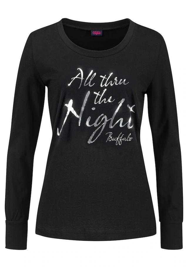 Langarmshirt mit trendigem Frontdruck. Mit coolen Rippbündchen an Rundhalsausschnitt und Ärmeln. Lange Hose mit tollem Allover-Druck, tieferem Schritt, kontrastfarbenem, elastischem Bund, Eingrifftaschen und elastischen Beinabschlüssen. Schritt sitzt tiefer. Schwarz mit silberfarbenem Glanzprint. Weich fließende Qualität aus 100% Baumwolle.