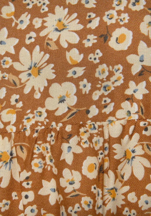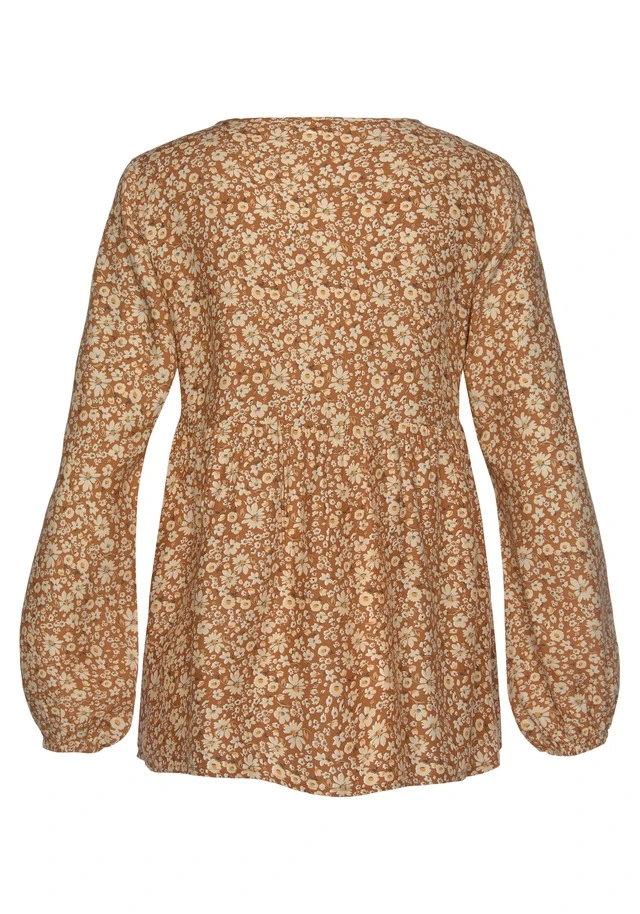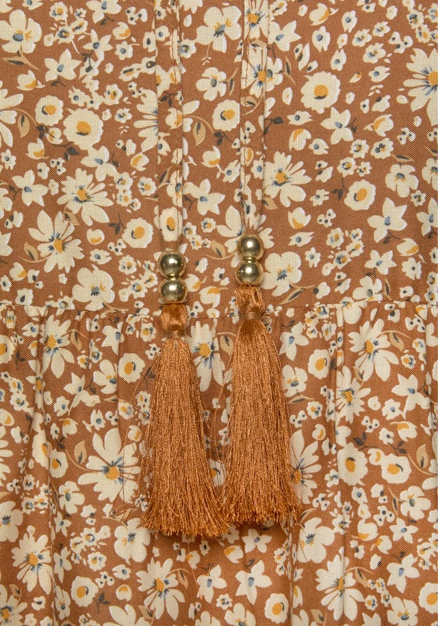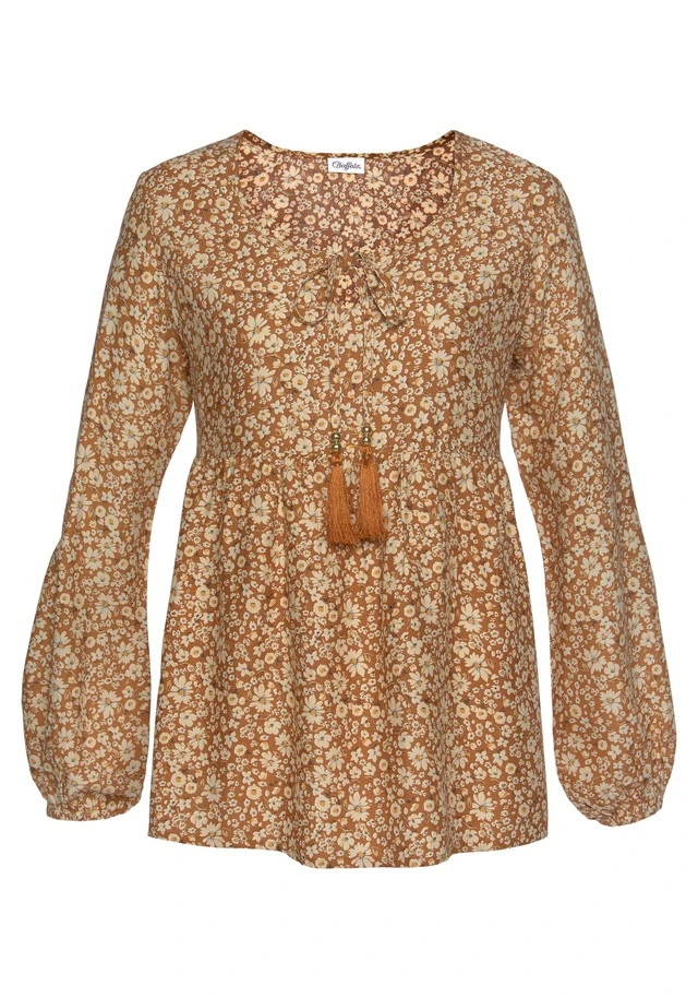 Bluse von BUFFALO. Bindeband mit goldfarbenen Zierperlen und Quasten am Ausschnitt. Unterbrustnaht, darunter leicht ausgestellt. Lange Ärmel mit Gummizug. Allover mit Blümchen bedruckt, jedes Teil ein Unikat. Länge ca. 68 cm. Nachhaltige, gewebte Qualität aus 100% Viskose.