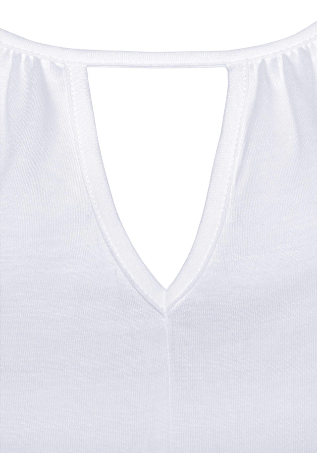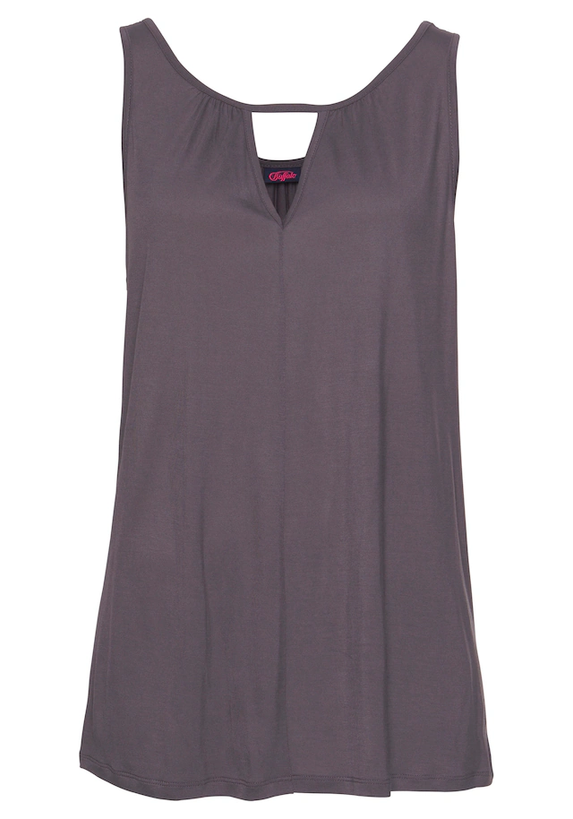 In lässig-weiter Form. V-förmiger Cut-out vorn mit Bändchenverzierung rundum. Gerundeter Saum. Länge ca. 64 cm. Aus 100% Viskose.