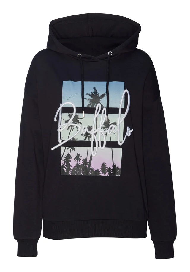 Kapuzensweatshirt von Buffalo. Mit großem Fotoprint und Labelstickerei auf der Brust. Kleines Logodetail am Saum. Kapuze mit Tunnelzug. Gerippte Bündchen. Überschnittene Schultern. Für Freizeit und Sport. Weiche Sweatqualität.