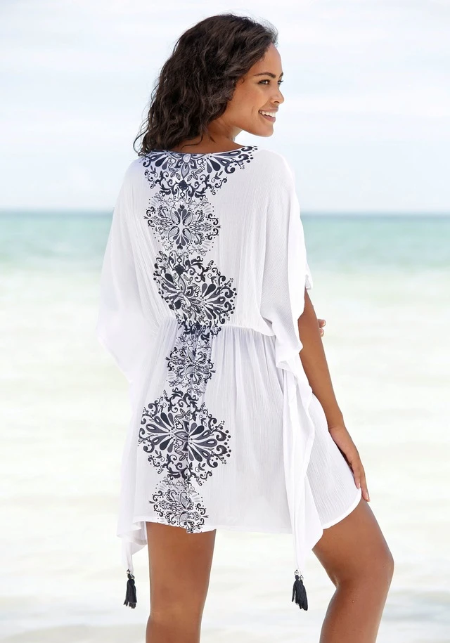Tunika von Buffalo mit Druck vorne und hinten. Weite, kurze Ärmel, Gummizug in der Taille. Gekreppte Viskoseware.