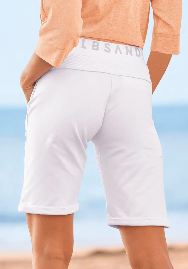 Sweatshorts von Elbsand. Breiter Tunnelzugbund mit auffälligem Bindeband und Markendruck. Vorderseite mit seitlichen Eingrifftaschen. Eine Gesäß-Leistentasche. Schmaler Umschlagsaum. Körpernahe Passform. Sweatware mit weichem Griff.