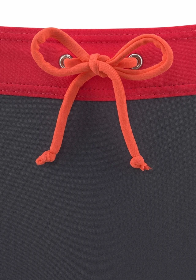 Sportiver Trend-Look für eine Top-Figur am Strand. In 2 trendigen Farbkombinationen. Top mit Kontrastpaspelierungen, kleinem Logodruck und sportivem Ringerrücken. Hotpants mit Kontrastbündchen und Außenkordel. Top vorne gefüttert.