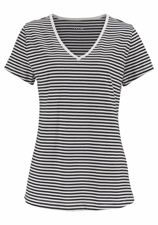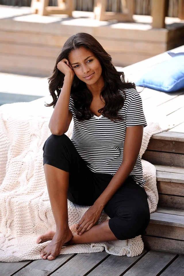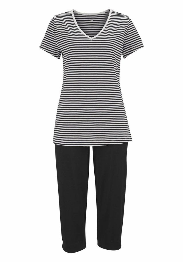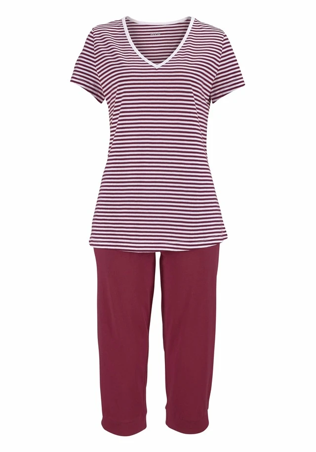 Gestreiftes Shirt mit V-Ausschnitt. ¾-Hose mit seitlichen Taschen, elastischem Bund und Beinsäumen. Hingucker ist der gestreifte Hosenbund und die gestreiften Taschen.Schwarz und Bordeaux aus 100% Baumwolle. Hellgrau meliert: Shirt aus 95% Baumwolle, 5% Polyester. Hose aus 90% Baumwolle, 10% Polyester.