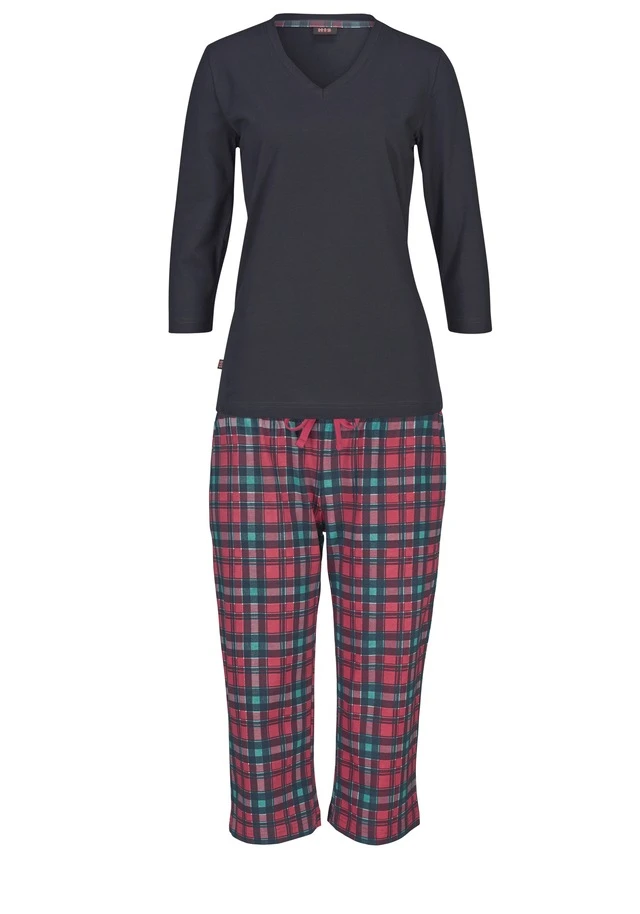 Toller Capri Pyjama von HIS. Oberteil mit ¾-Ärmeln und V-Ausschnitt. Kariert bedruckte Caprihose mit elastischem Hosenbund. Aus weichem Single Jersey aus 100% Baumwolle.