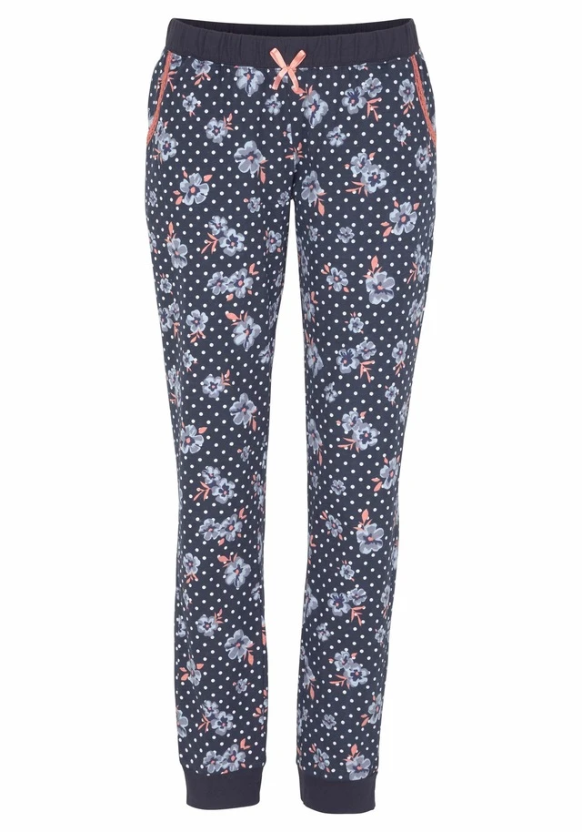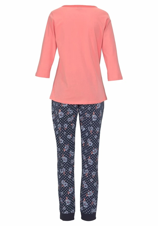 Pyjama von H.I.S mit Spitzendetails am gerundeten V-Ausschnitt mit Zierknopfleiste und 3/4-Ärmel. Floral gemusterte Hose mit elastischen Tunnelzugbund und Spitzenbesatz an den seitlichen Eingrifftaschen. Bündchen an den Beinsäumen. Koralle/marine gepunktet: Aus 100% Baumwolle. Mint/hellgrau gepunktet: Aus 90% Baumwolle und 10% Polyester. Ecru/anthrazit gepunktet: Aus 60% Baumwolle und 40% Polyester.
