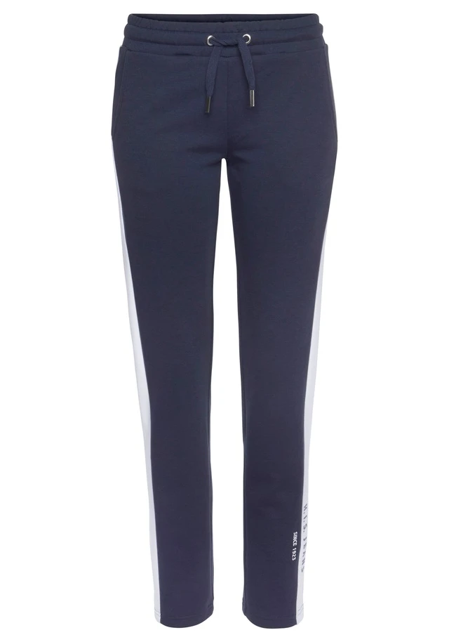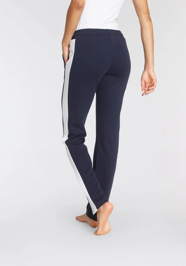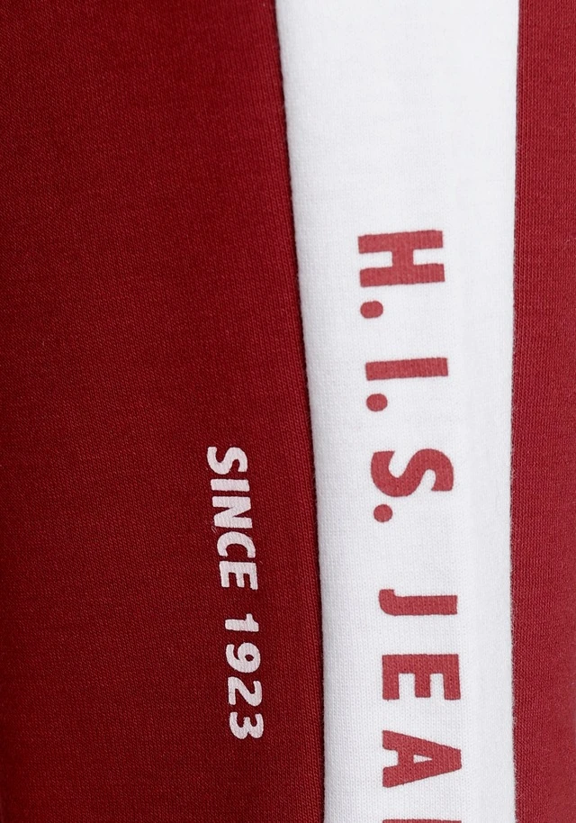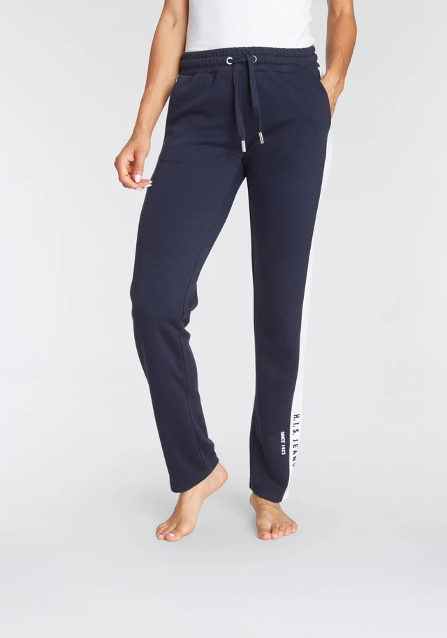 Sportliche Relaxhose von H.I.S. Breite Kontraststreifen mit Labelprint am Abschluss. Seitliche Eingrifftaschen. Elastischer Kordelzugbund. Für Freizeit und Sport. Weiche Interlockqualität.