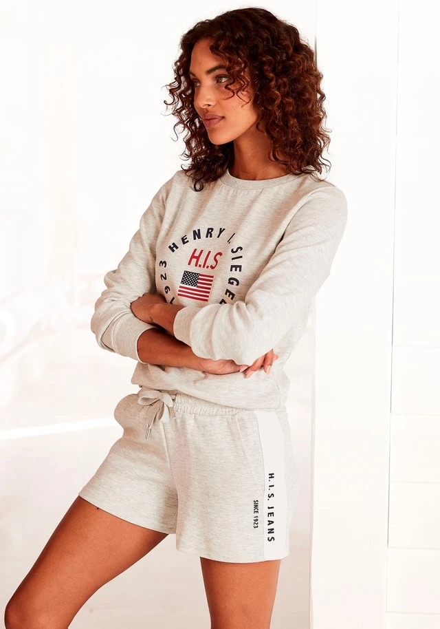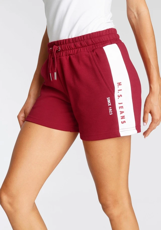 Knackig-kurze Sweatshorts von H.I.S. Breite Kontraststreifen mit Labelprint seitlich. Elastischer Kordelzugbund. Seitliche Eingrifftaschen. Schön für warme Tage. Weiche Interlockqualität.