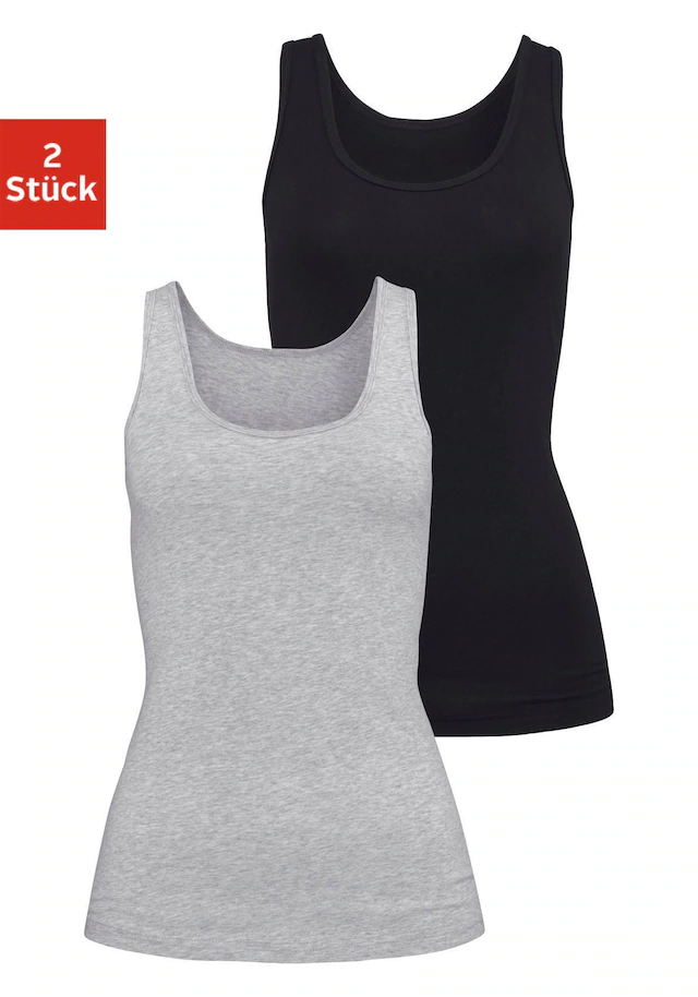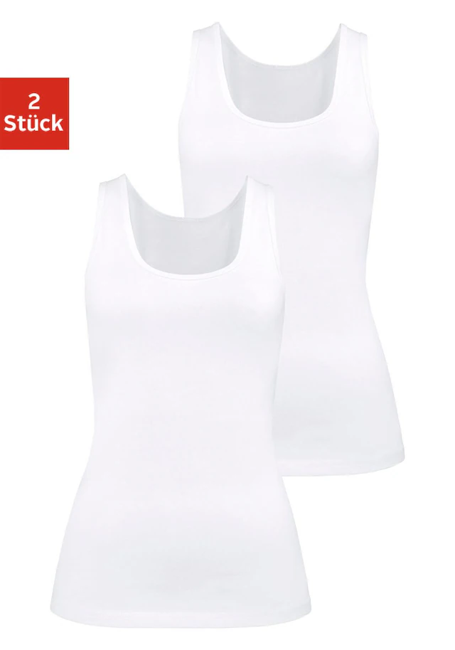 Basic-Achseltops von H.I.S im praktischen 2er-Pack. Flache Einfassungen an Hals- und Armausschnitt. Aus trageangenehmer Baumwoll-Stretchqualität.