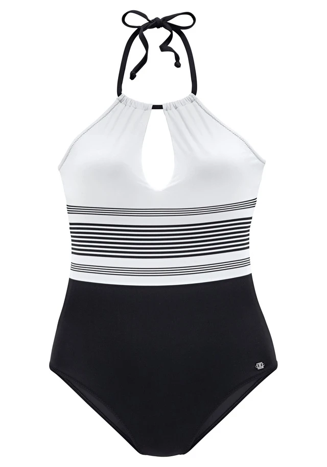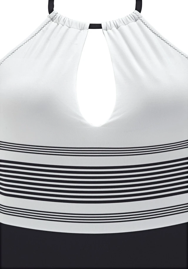 Kreiert von Designerin Jette Joop. Modernes Streifen-Design in eleganter Schwarz-Weiß-Optik mit herausnehmbaren Cups. Im Nacken zu binden und im Rücken zu schließen. Bis C-Cup geeignet.