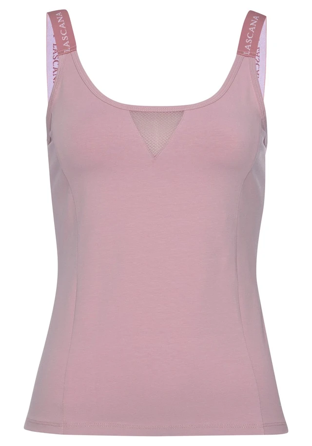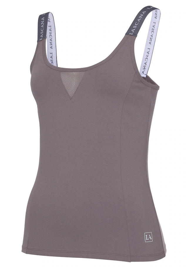 Performance Top von Lascana Active. Elastische Träger mit Logoschriftzügen. Mesh Einsatz im Brustbereich. Aus 92% Baumwolle (unterstützt Cotton made in Africa), 8% Elasthan