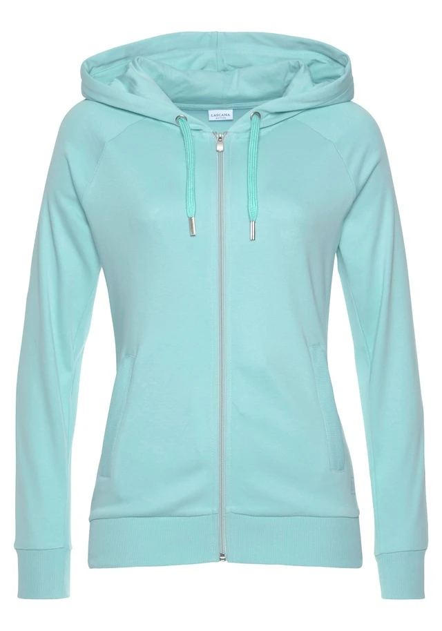 Performance-Sweatjacke von Lascana Active. Kapuze mit Kordelzug. Raglanärmel mit seitlichen Logotapes. Elastische Bündchen. Seitliche Reißverschlusstaschen. Passt zu allen Sporthosen und Jeans. Feine, weiche Baumwollqualität.