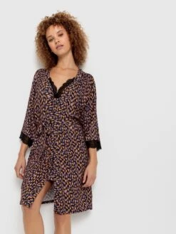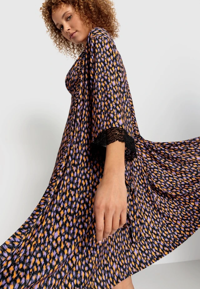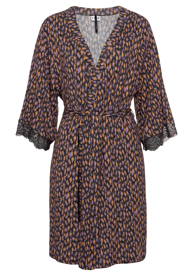 Kimono mit 3/4 Ärmeln, Taillengürtel und schönen Spitzenabschlüssen. Angenehme Viskosequalität.