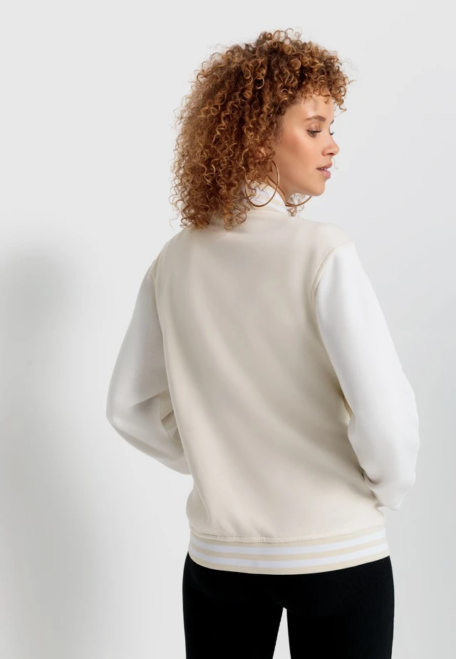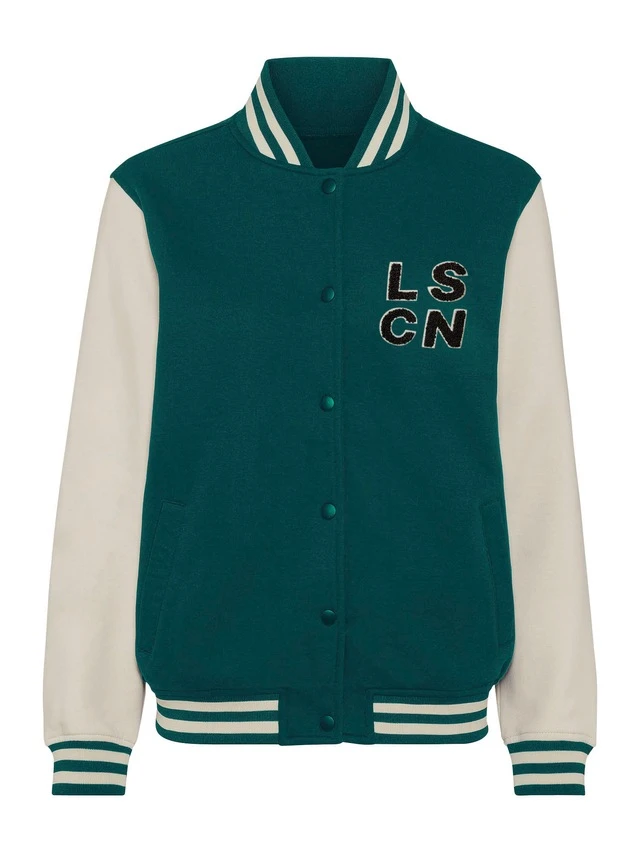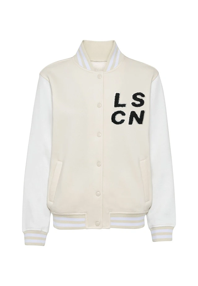Sweatjacke von LSCN by Lascana im Collegestyle. Farblich abgesetzte Ärmel. Durchgehende Druckknopfleiste. Leistentaschen. Collegekragen und Saumbündchen mit Streifen. Gerade Passform. Weiche Sweatware mit hohem Baumwollanteil.