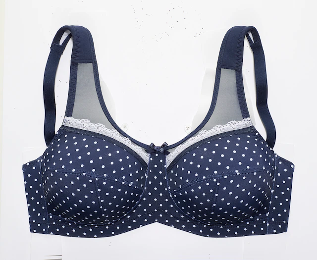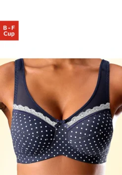 Ohne Bügel. Modischer Pünktchen-Druck mit Satinband und Spitzenband als schönes Detail an der Cupkante. Netzeinsatz am Dekolleté. Breitere Träger für einen hohen Tragekomfort. Träger und Rückenverschluss verstellbar. Klassische Dessous. Bequeme Alltags-Dessous. Modische Dessous. Der Entlastungs-BH ist aus 90% Polyamid, 10% Elasthan.