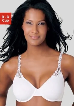 T-Shirt-BH von NUANCE mit nahtlos vorgeformten, ungefütterten Cups, ohne störende Nähte. Perfekt unter eng anliegender Kleidung. Aus weichem Microtouch-Material mit Bügel. Schmuckträger aus Stickereimotiven. Die Träger hinten in der Länge verstellbar. Der Rücken ist ebenso verstellbar. Klassische Dessous. Bequeme Alltags-Dessous. Modische Dessous. Aus 85% Polyamid, 15% Elasthan.