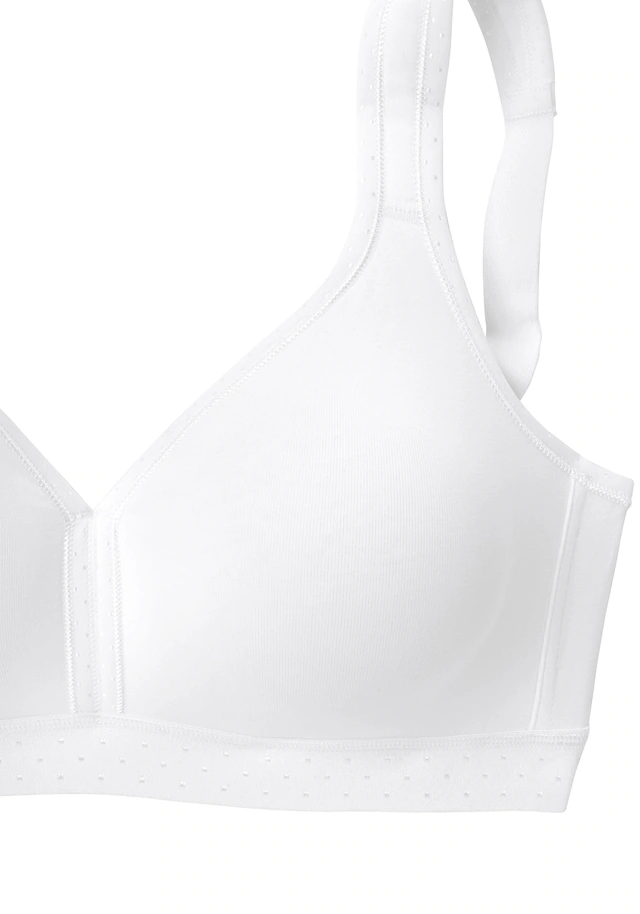 PETITE FLEUR: BH ohne Bügel im 2er Pack. Gemoldetes Cup. Schönes Pünktchen-Muster am Unterbrustband und an den Paspeln. Entlastende, breitere Träger für einen angenehmen Tragekomfort. Träger und Rückenverschluss verstellbar. Klassische Dessous. Bequeme Alltags-Dessous. Modische Dessous. Der BH ist aus 90% Baumwolle, 10% Elasthan. BHs sind nicht trocknergeeignet, da die Versteller und Ringe durch die Hitze beschädigt werden und brechen.