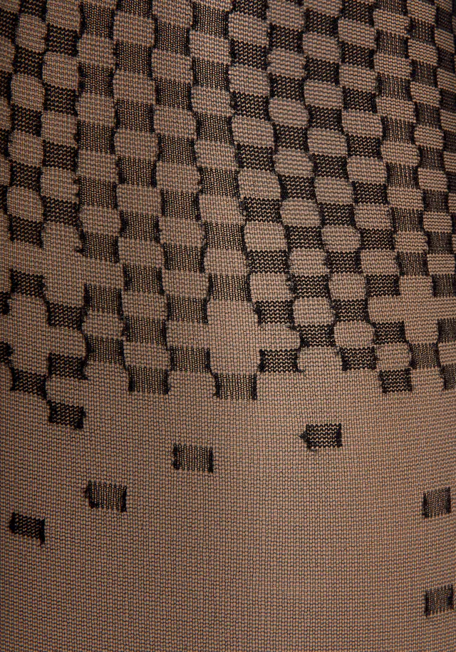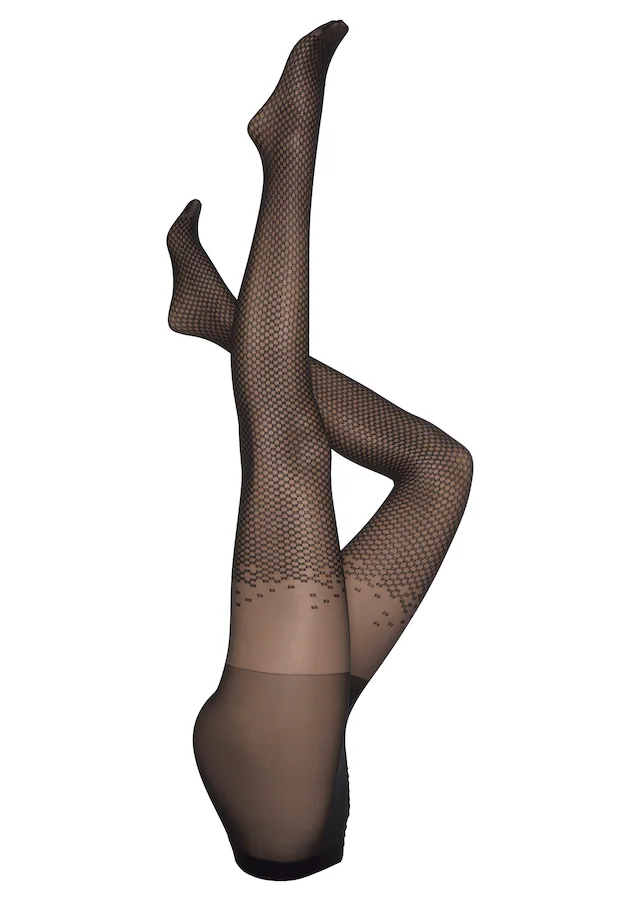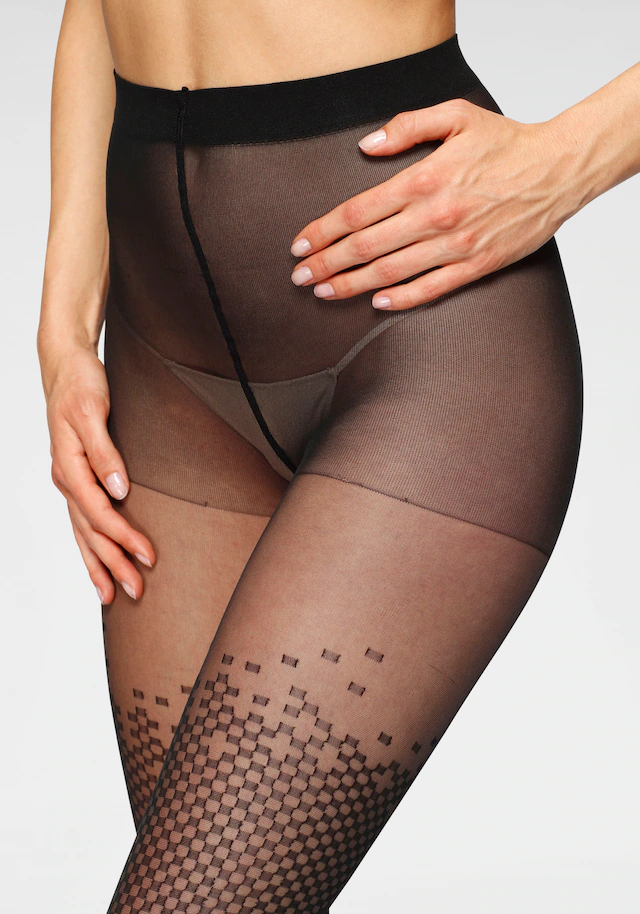 Grafisch gemusterte Feinstrumpfhose von Petite Fleur Gold. In hübscher Overknee-Optik. Ideal zu kombinieren mit kurzem Rock. Transparente, elastische 20DEN-Qualität.