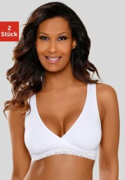 Petite Fleur Still-BH in Wickelschlupf-Form im 2er Pack. Super bequemer BH ohne Bügel. Auch als Schlaf-BH geeignet. Süßes Spitzenband entlang der Unterbrust. Klassische Dessous. Bequeme Alltags-Dessous. Modische Dessous. Aus 87% Modal, 7% Polyamid und 6% Elasthan.