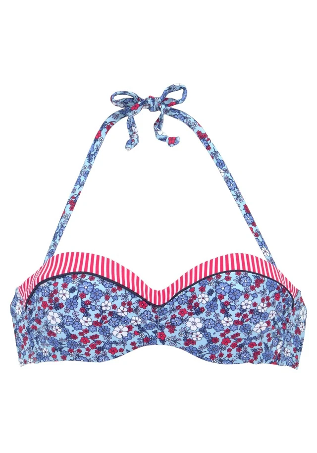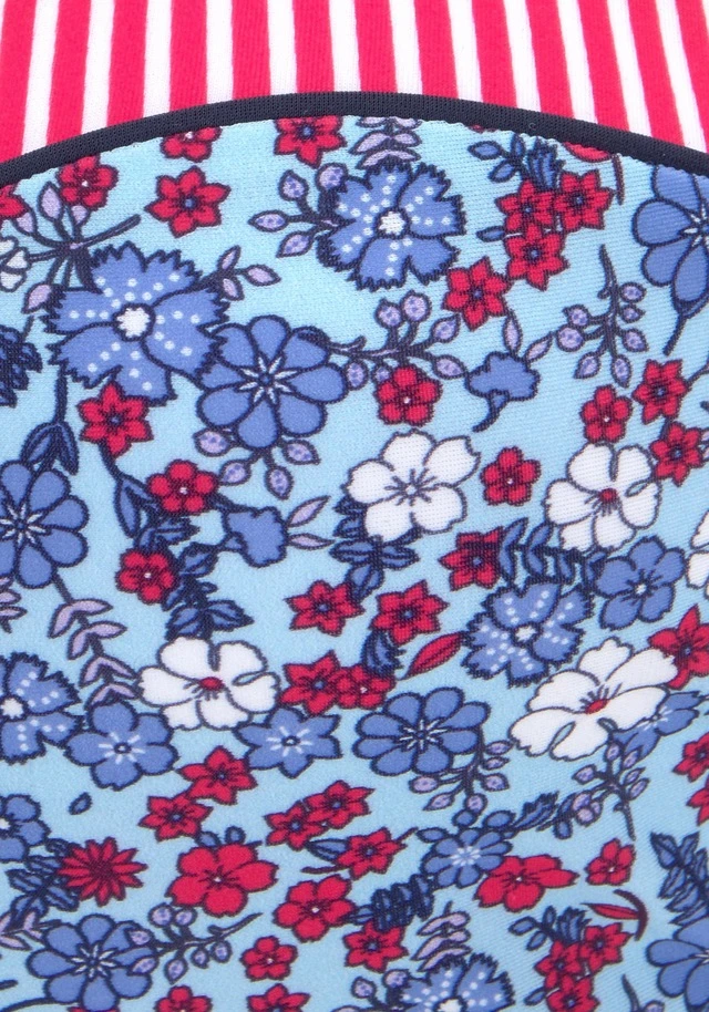 Mit Blümchendruck oder im Streifendesign. Wattierte Cups und seitliche Stäbchen. Abnehmbare Träger, im Nacken zu binden. Im Rücken zu schließen.