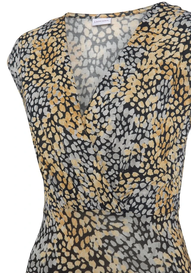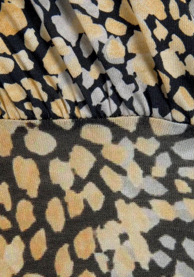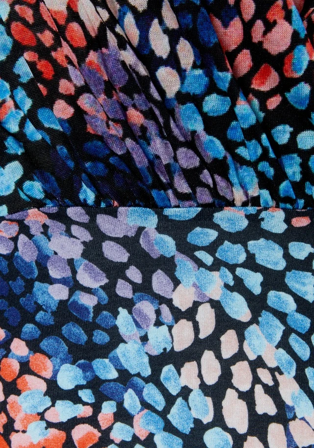 Kleid von s.Oliver mit Allovermuster. Tiefer V-Ausschnitt in Wickeloptik. Gummizug auf Taillenhöhe. Ausgestellte Passform. Weich fließende Viskoseware.