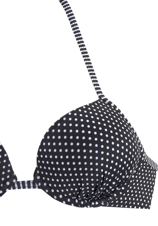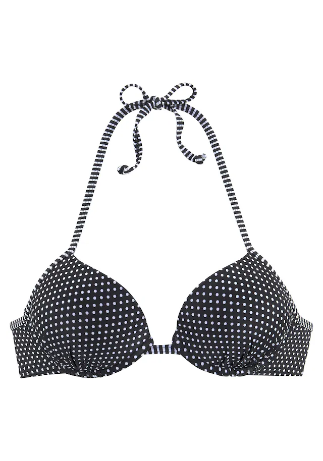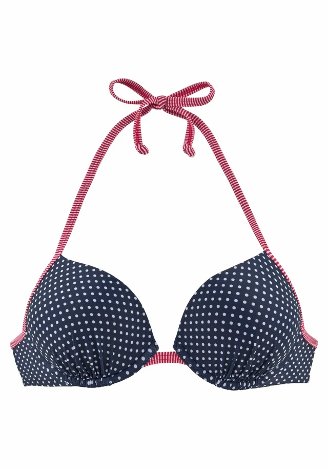Im modischen Mix mit Punkte- und Streifenprints. Wattierte Cups mit eingearbeiteter Verstärkung für ein tolles Dekolleté. Im Nacken zu binden und im Rücken zu schließen.