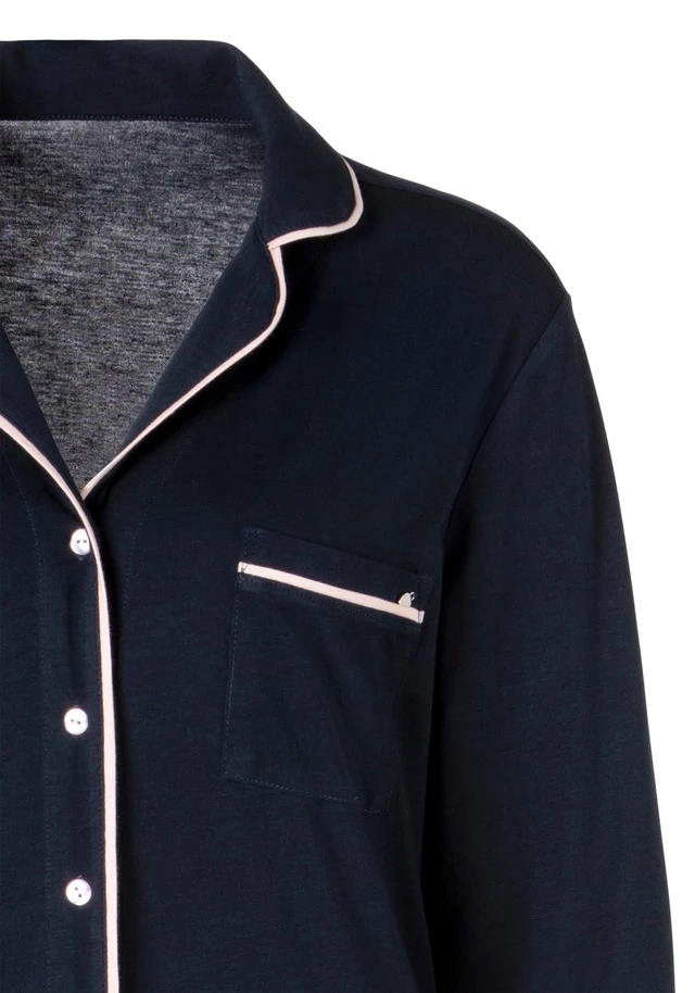 Klassischer Pyjama mit Reverskragen, durchgehender Knopfleiste, Brusttasche und Kontrast Piping. Lange Pyjamahose mit Stretch Tunnelzugbund. Angenehme Baumwoll-Viskosequalität.