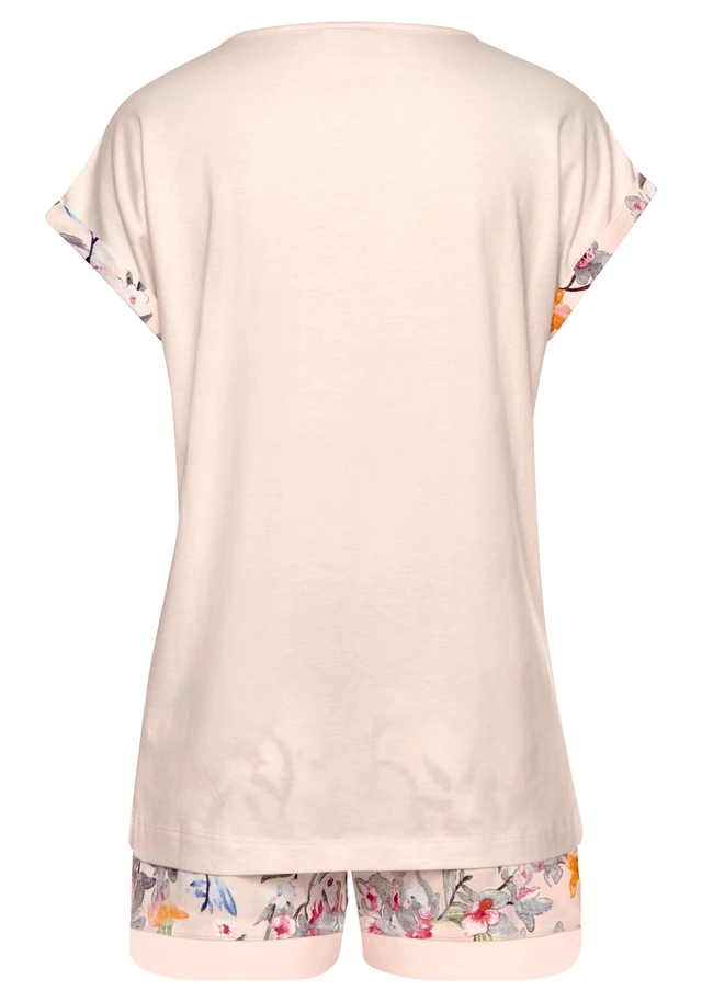 Shirt mit V-Ausschnitt. Kurze Ärmel mit Umschlag in Blütenmuster. Bedruckte Shorts mit elastischem Tunnelzugbund. Weiche Qualität aus 50% Baumwolle (unterstützt Cotton made in Africa), 50% Viskose.