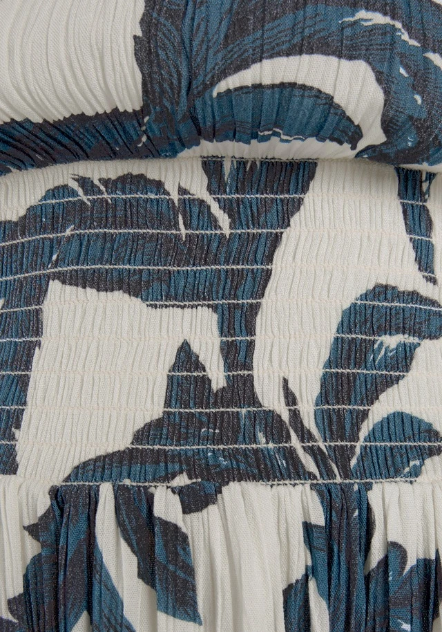 Feminines Druckkleid von S.Oliver. V-Ausschnitt. Gerüschte Flügelärmel. Breiter Smokeinsatz in der Taille. Allover bedruckt, jedes Teil ein Unikat. Trageangenehme Crêpeware.