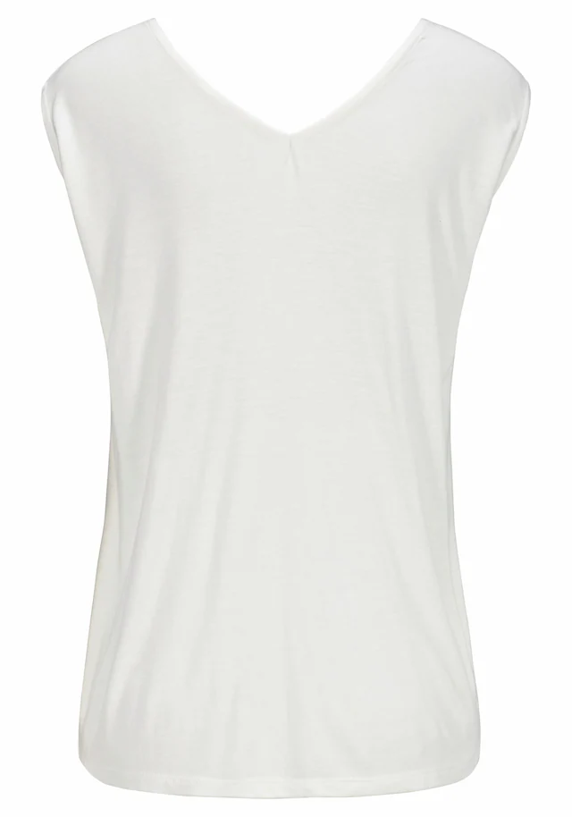 Vorn und hinten mit tiefem V-Ausschnitt, der mit Bändern modisch verziert ist. In creme leicht transparent. Länge ca. 64 cm. Aus 100% Viskose.