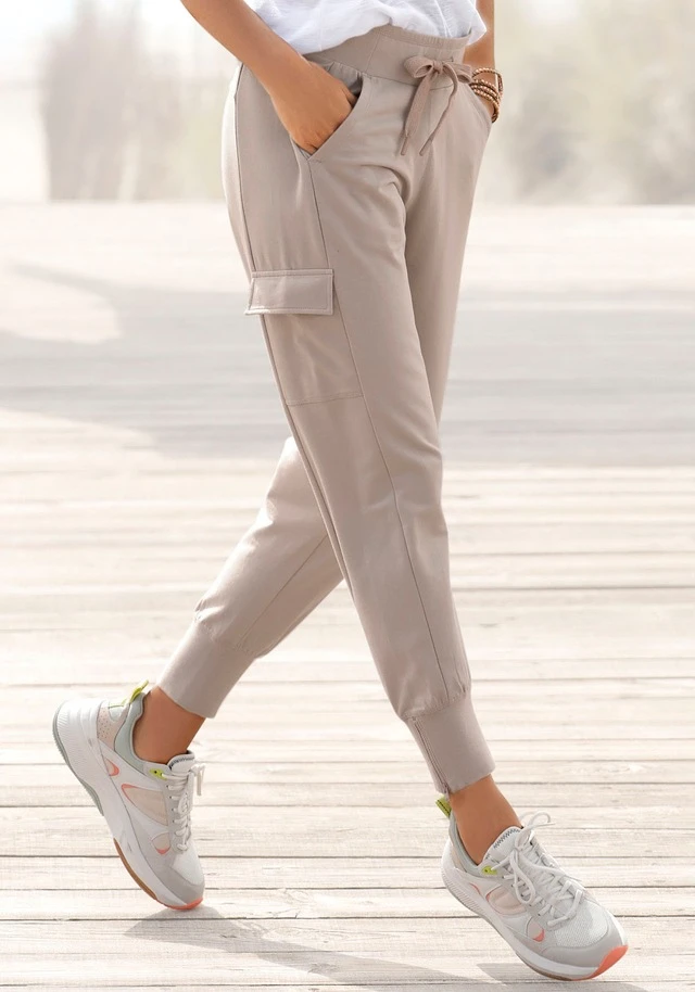 Cargohose von Venice Beach aus weicher Sweatware. In lässiger Passform mit bequemem Gummibund mit Kordel, seitlichen Eingrifftaschen und gerippten Bündchen an den Beinabschlüssen.