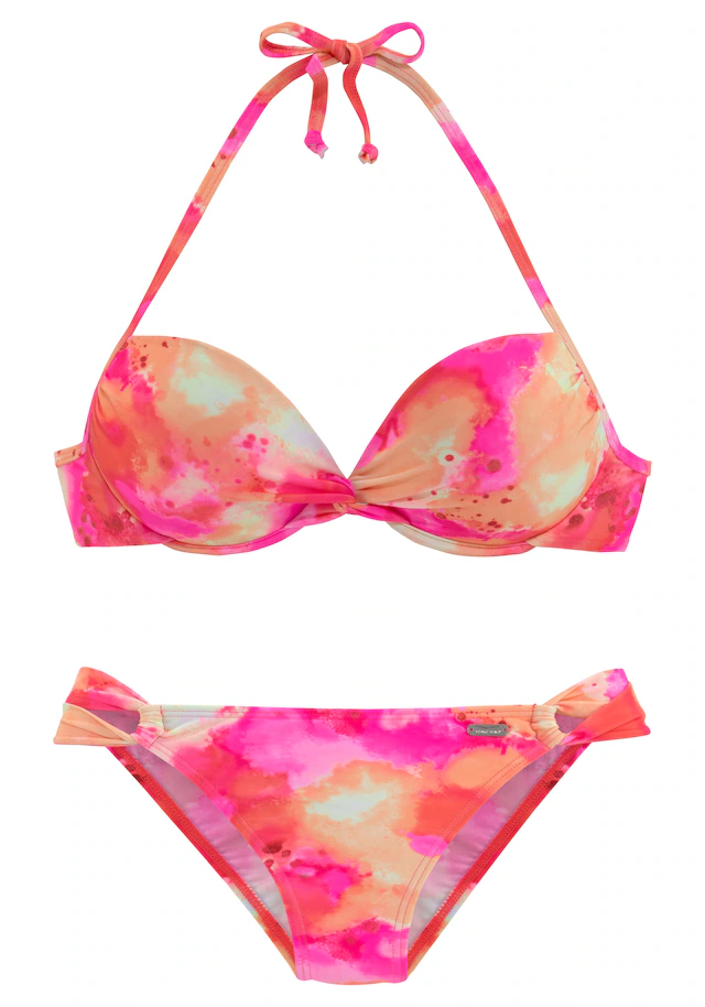 Push-up-Bikini von Venice Beach. Alloverprint in Tie-Dye-Optik. Neckholder zum Binden. Cups mit Kisseneinlage. Im Rücken zu schließen. Bikinihose mit raffiniert seitlich verschlungenen Bändern. Angenehme Qualität.