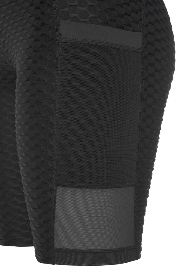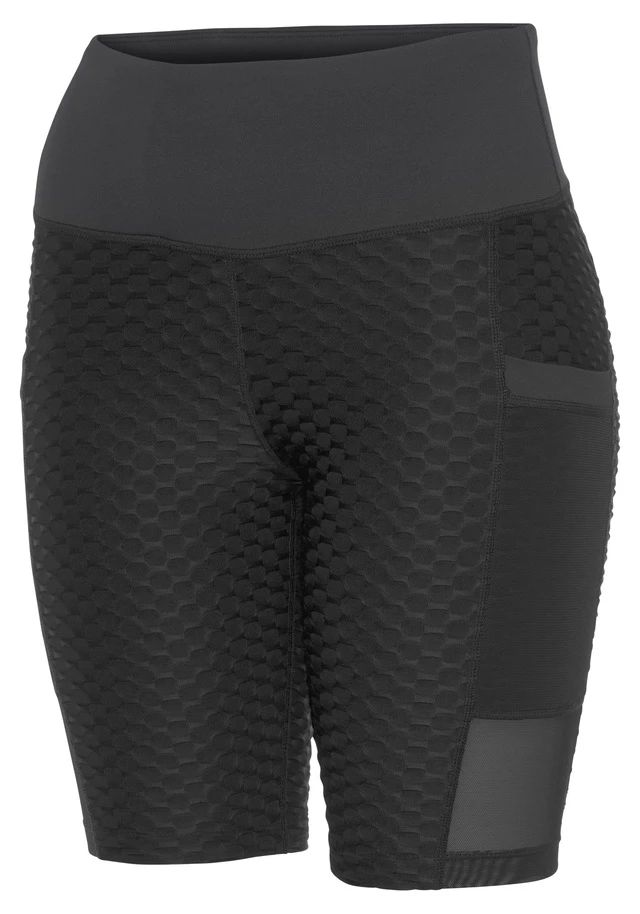 Funktions-Bikershorts in Wabenoptik mit breitem Bund mit innenliegender Tasche. An den Beinen seitlich mit Mesh-Einsätzen, links mit Handytasche. Aus 86% Polyester, 14% Elasthan.