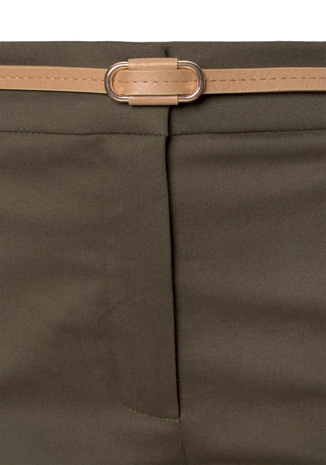 Chinohose mit Lederimitat-Gürtel von VIVANCE. Seitliche Eingrifftaschen, 2 Paspeltaschen hinten. In 7/8-Länge. Schmal zulaufendes Bein mit kleinem Schlitz. Innenbeinlänge ca. 68 cm. Aus 98% Baumwolle, 2% Elasthan. Gürtel: 100% Polyurethan.