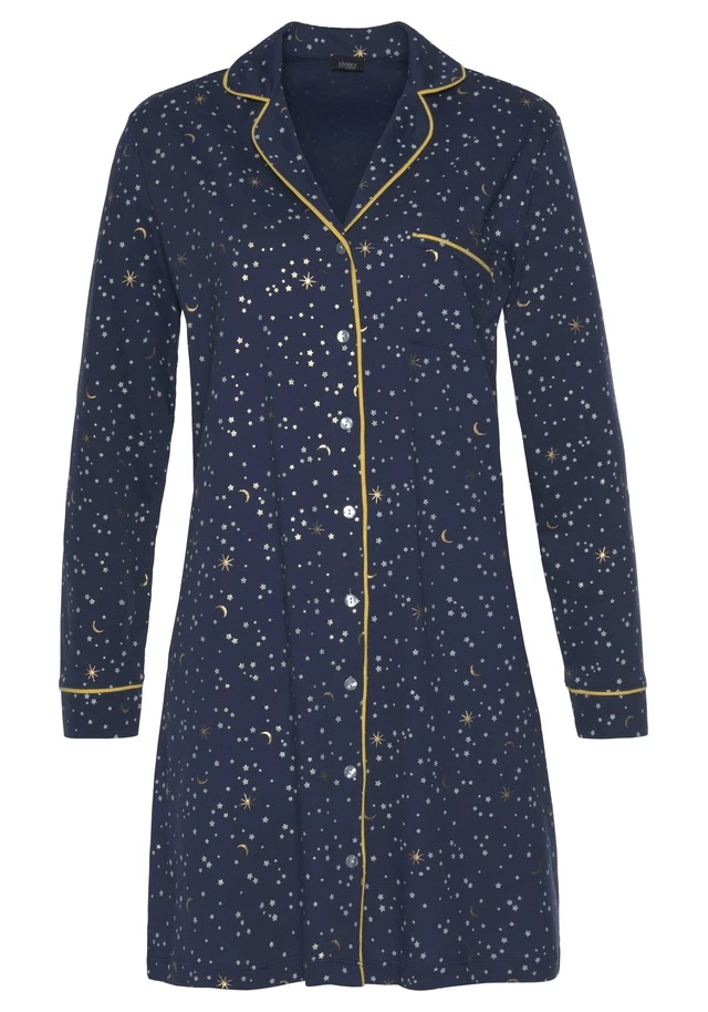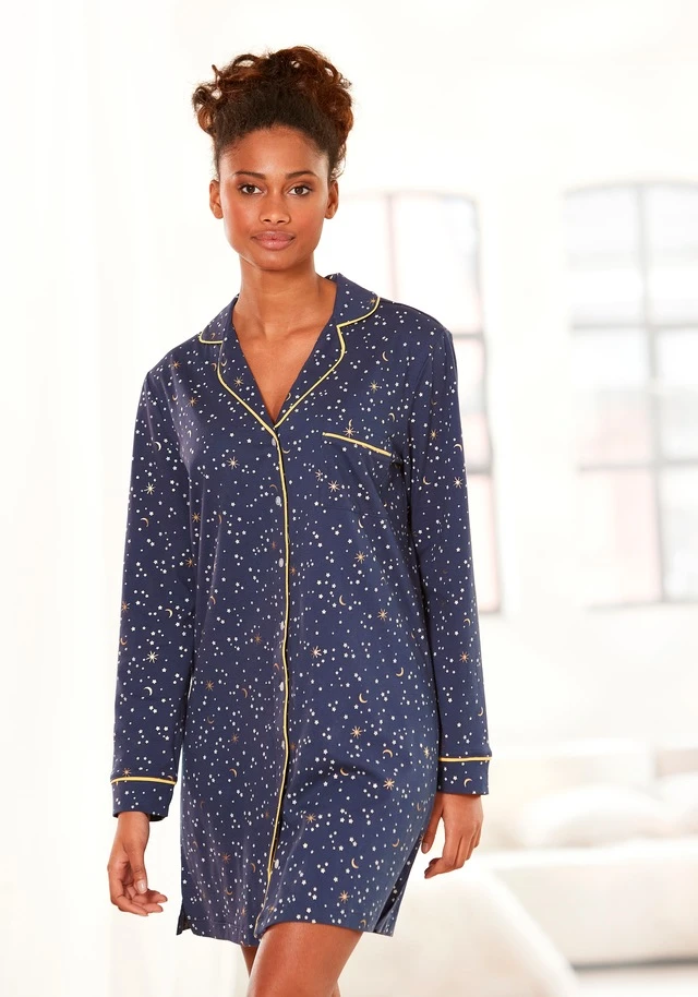 Klassisches Nachthemd mmt Reverskragen und allover Print. Lange Ärmel mit Paspelierten Manschetten. Angenehme Baumwollqualität.