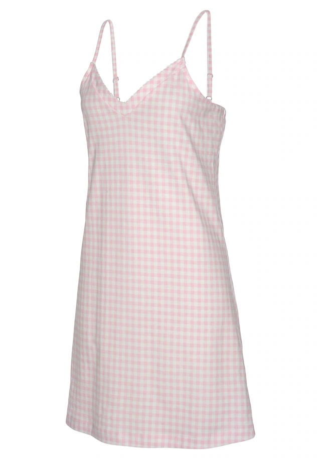 Kurzes Negligé von Vivance Dreams mit Karomuster. V-Ausschnitt mit zarter Häkelkante. Längenregulierbare Spaghettiträger. Leicht ausgestellte, bequeme Passform. Weiche Baumwollqualität.