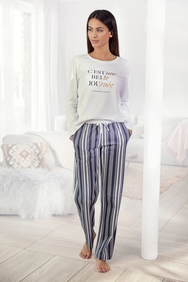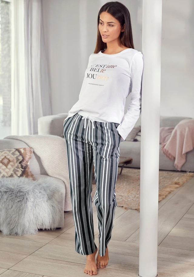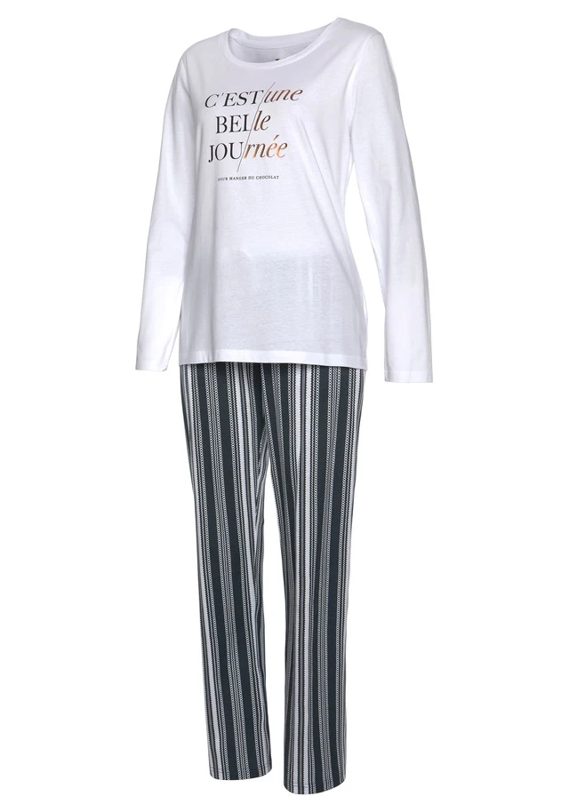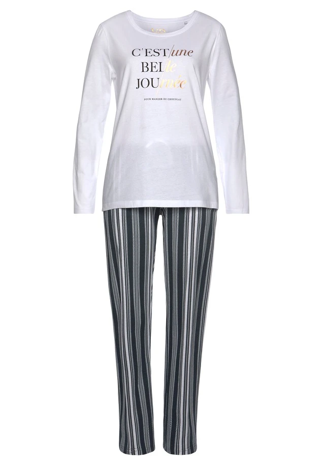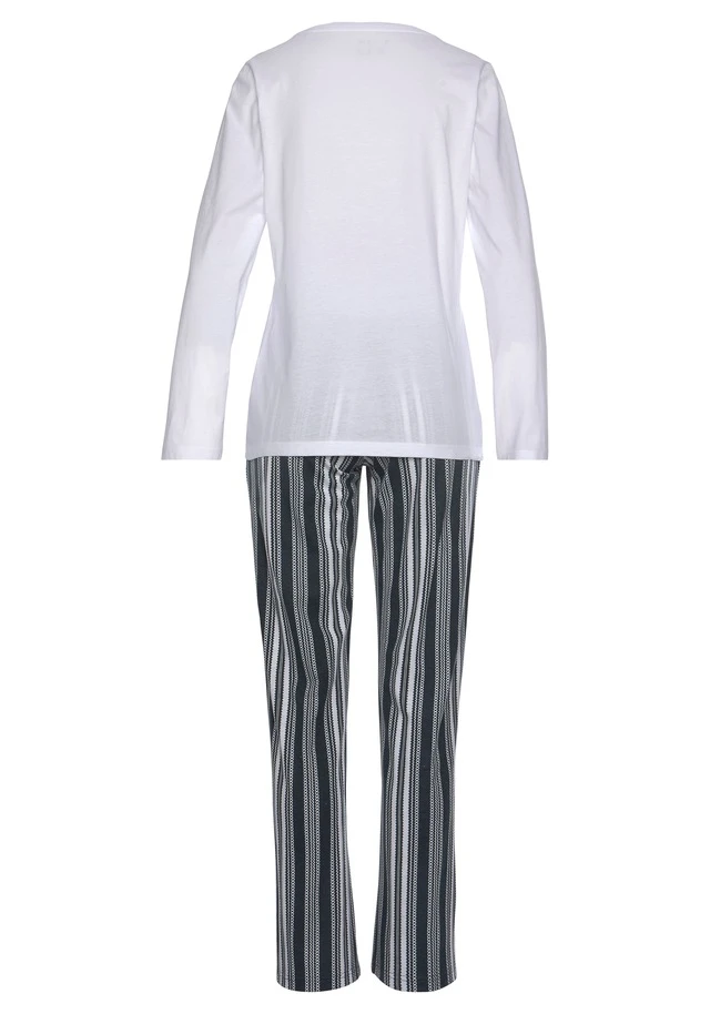 Pyjama mit klassischem Longsleeve und Frontdruck. Weit geschnittene Hose mit allover Print und elastischem Tunnelzug. Angenehme Baumwollqualität.